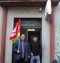 En médaillon, Majid délégué syndical, devant le commissariat.