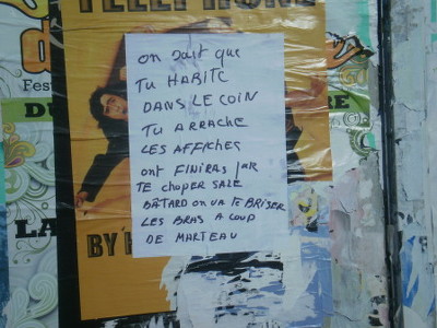 « on sait que tu habite dans le coin tu arraches les affiches ont finiras par te choper sale bâtard on va te briser les bras a coup de marteau »