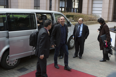 Nous n’envisagerons jamais une sortie de la zone euro a déclaré Yanis Varoufakis (ministre des finances) à Paris Match. ici lors de son arrivée à Bruxelles.