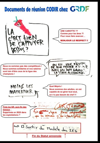 Dans ce document de travail de la direction sur lesquels les salariés sont tombés par hasard la direction expose succinctement tout le respect qu’elle a des salariés et jusqu’où elle veut aller. En rouge les commentaires de la CGT énergie.