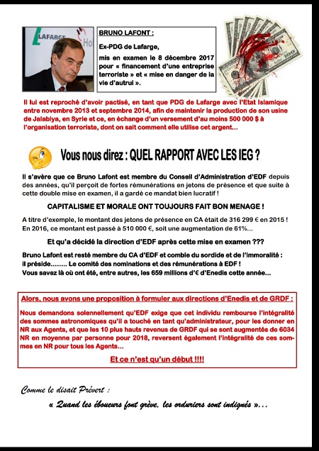 – De ce grand commerçant d'avec Daesh (vous avez bien lu voir verso tract CGT énergie ci-dessous) maintenu au CA d'EDF malgré sa mise en examen ?