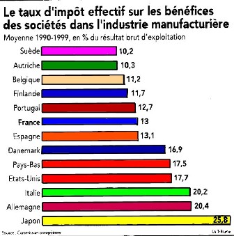 Notre journaliste ne s’en tient pas à la seule explication sur l’aberration à chercher à comparer des taux incomparables. Il dévoile une étude : « Heureusement, un économiste de la direction des affaires économiques et financières de la Commission européenne a fait le tour de la question. Cherchant à établir des comparaisons indiscutables, Gaétan Nicodème s’est appuyé sur l’impôt effectivement acquitté sur leurs bénéfices par les sociétés de l’industrie manufacturière en Europe, aux Etats-Unis et au Japon entre 1990 et 1999.