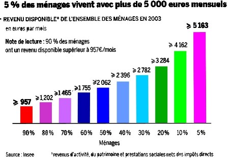 Observons que l’ampleur du débat sur la baisse des impôts sur le revenu, concerne 5 % des ménages (graphique ci-après) et que par ailleurs 50 % des ménages sont exclus de cette baisse puisque ne payant pas d’impôt sur le revenu, du fait de leur salaire trop faible (expliquant la création de la P.P.E (prime pour l’emploi).