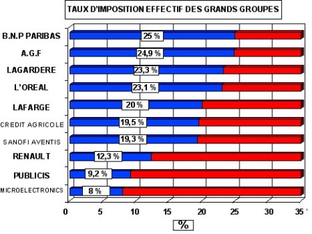 La cerise sur le gâteau : Ce graphique visualise pour les grands groupes industriels la différence entre le taux d’imposition théorique déterminé par la loi (35 %) et le taux effectivement appliqué en bleu. On constat que pour ces grands groupes côtés au C.A.C 40, le taux qui s’applique effectivement n’est pas de 35 % mais varie de 25 % à moins de 10 %. Comment est ce possible. Le journaliste explique : « Depuis 1995, la dispersion des taux a été sensiblement réduite. Mais les écarts entre les impôts réellement versés ne se sont guère resserrés. Il apparait en outre que, en France notamment, les plus grandes entreprises bénéficient d’un impôt réel parmi les plus bas des pays étudiés, et sensiblement plus léger que celui qu’acquittent les PME. [7]