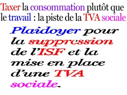 5] Plus le vol est gros plus il rapporte : Une des propositions vise notamment à remplacer une partie de nos impôts par ce qui est appelé la T.V.A SOCIALE. Il s’agit selon leurs promoteurs de la mise : « en place d’une T.V.A sociale permettant de financer une partie des dépenses de protection sociale (maladie, retraites...) non plus par des cotisations sociales assises sur les salaires, mais par une hausse des taux de la TVA. Selon ses partisans, ce dispositif permettrait de réduire le déficit commercial en abaissant le prix des produits français à l’étranger et en augmentant celui des biens étrangers importés. Si Nicolas Sarkozy est favorable à la TVA sociale, Ségolène Royal ne s’est pas encore clairement prononcée. » [9]