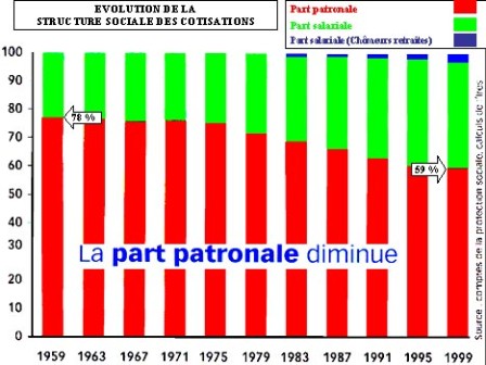 6] La structure sociale des cotisations : En 1959, la part patronale dans le financement de la structure sociale des cotisations contribuait à hauteur de 78 %. Aujourd’hui celle-ci n’est plus que de 59 %. L’objectif de la « T.V.A sociale » est d’aller jusqu’au bout de la logique de baisse des contributions patronales, en les exonérant de toute responsabilité sur la question de la santé des salariés en transférant l’ensemble des cotisations sur l’Etat et les salariés par l’intermédiaire du développement des assurances privées : « Il suffirait de réformer notre protection sociale en séparant ce qui relève de la solidarité à financer par l’impôt, et de services d’assurance, dont la nature est d’être vendus ». [11]