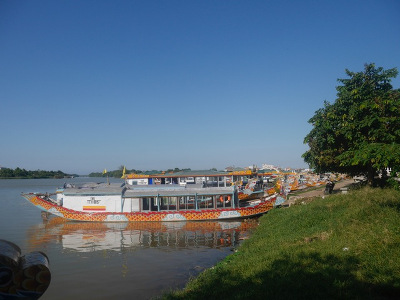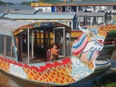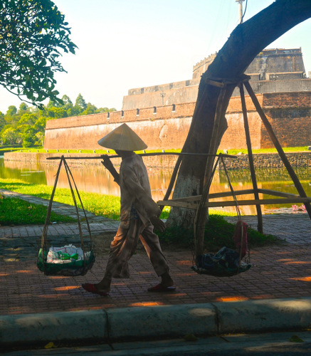 Nous avons fait un petit tour de pirogue à moteur sur la rivière aux parfums (au moins six fois la largeur de la Seine) qui traverse la ville et nous nous sommes régalés de cuisine de rue le long des douves de la citadelle, à l’ombre des arbres.
