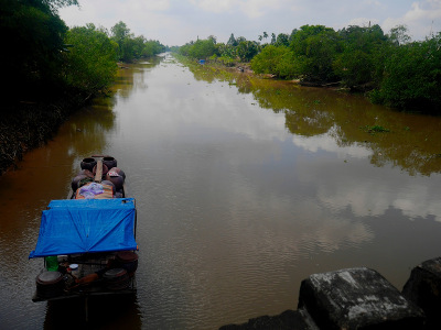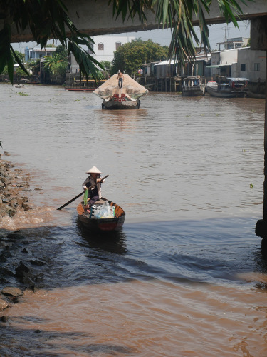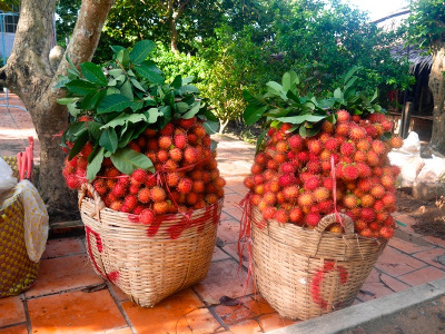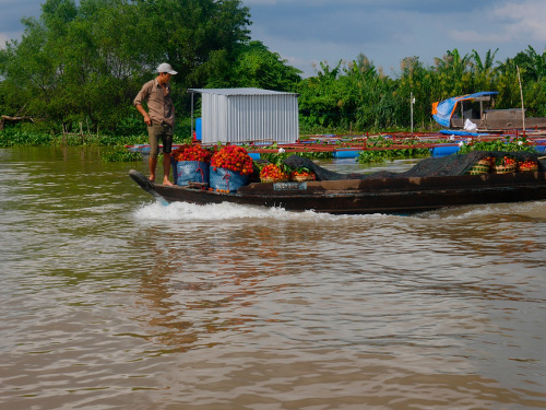 C’est la saison des litchis et des longanes, nous croisons des bateaux chargés de monceaux de litchies (ceux qui sont très gros et poilus).