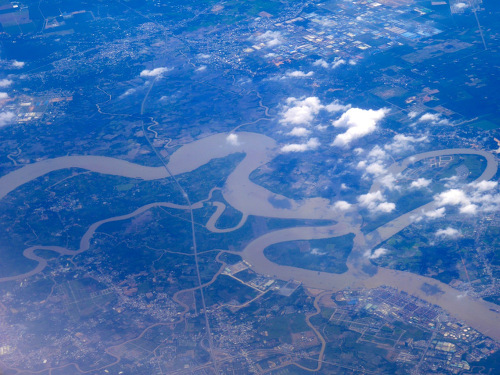 Lors de notre arrivée, j’ai pris des photos d’avion des méandres du Mékong, c’est spectaculaire, le fleuve mesure 4350 km et traverse six pays.