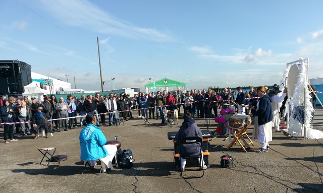 Le débat se termine à peine qu’immédiatement devant le stand la troupe sud-coréenne DONGHAENURI entame son spectacle pour la paix et contre l’impérialisme. Là aussi le spectacle n’était pas annoncé mais des dizaines de spectateurs, informés par les réseaux sociaux et les annonces au micro, se pressent autour de la troupe et applaudissent à tout rompre après chaque saynète et finissent en dansant en répondant à l’appel de la troupe...Un moment rare en France et qui fait évènement à la fête de l’Huma.