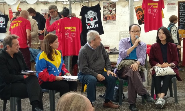 – Samedi 11h 30 un grand moment, ou plutôt deux grands moments en un sur l’espace. D’abord, animé par le collectif Polex, le débat sur la lutte contre l’impérialisme aujourd’hui avec la représentante de l’ambassade du Venezuela et un représentant du PDP de Corée du Sud. Un débat riche, où celles et ceux qui ont eu la chance d’y participer, on appris des tas de choses sur la réalité de ces deux pays et le rôle des américains remettant en cause la souveraineté de ces peuples et dont les représentants ont tenu à dire, chacun à leur tour, leur solidarité avec l’autre.