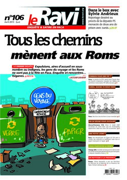 4 avril 2013Ce mois-ci, notamment à l’occasion du festival Latcho Divano, des cultures tsiganes 2013 (à Marseille du 30 mars au 8 avril) le mensuel satirique Le Ravi consacre un gros dossier aux Roms et gens du voyage. Cinq pages d’enquêtes : d’expulsions en aires d’accueil en sous-nombre ou carrément indignes, les Roms et les gens du voyage ne sont pas à la fête en Paca. Mais, titre Le Ravi, « Tous les chemins mènent aux Roms » et, au bout, d’intéressantes rencontres.