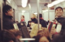 Entrent dans le wagon quatre hommes avec chacun un instrument, une contrebasse, deux accordéons, une guitare. Originaires, à première vue, des Balkans.