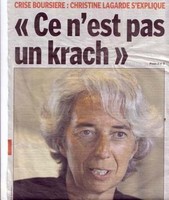 Au jour du renversement de tendance à la Bourse, la grande argentière Christine Lagarde l’a clamé très fort, avant d’en rajouter dimanche matin 21/9 sur Europe1 : "Le plus gros de la crise financière est derrière nous." Cependant que " notre système bancaire est solide et fonctionne bien".